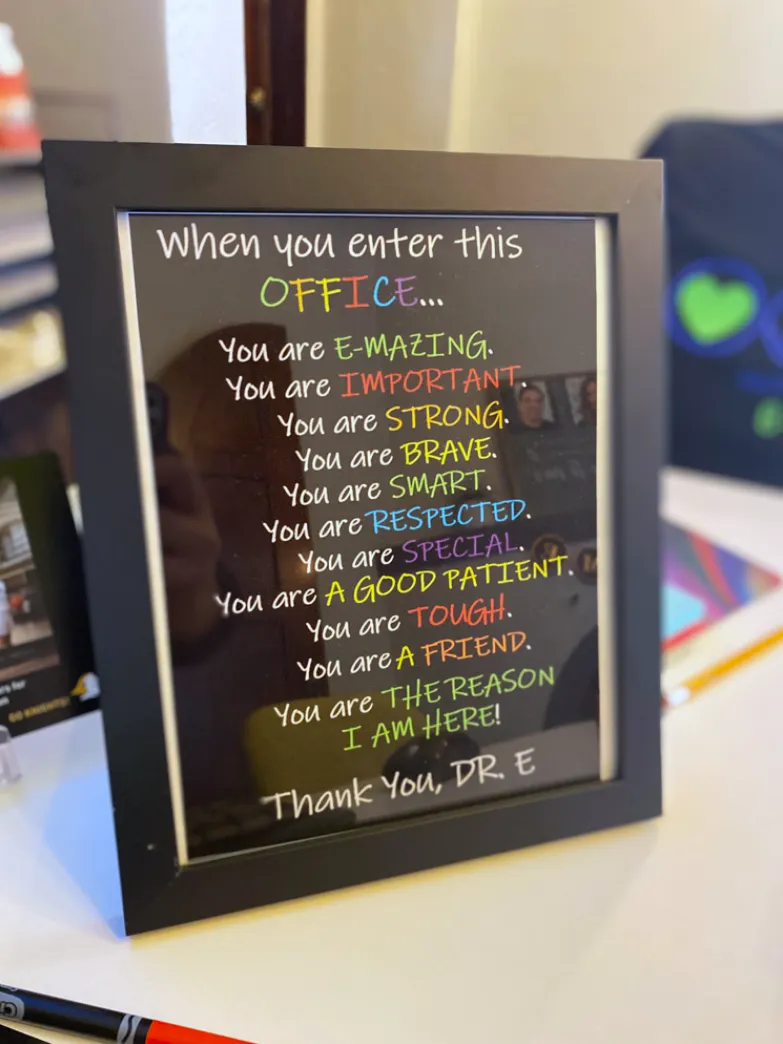 They are so personable and they make an extra effort to know every person who comes in. Also very impressive is how active Dr. E is in our local community. It’s good to know we are supporting local business and I feel Dr. E gives a lot back! Also, the office is very comfortable and comforting.